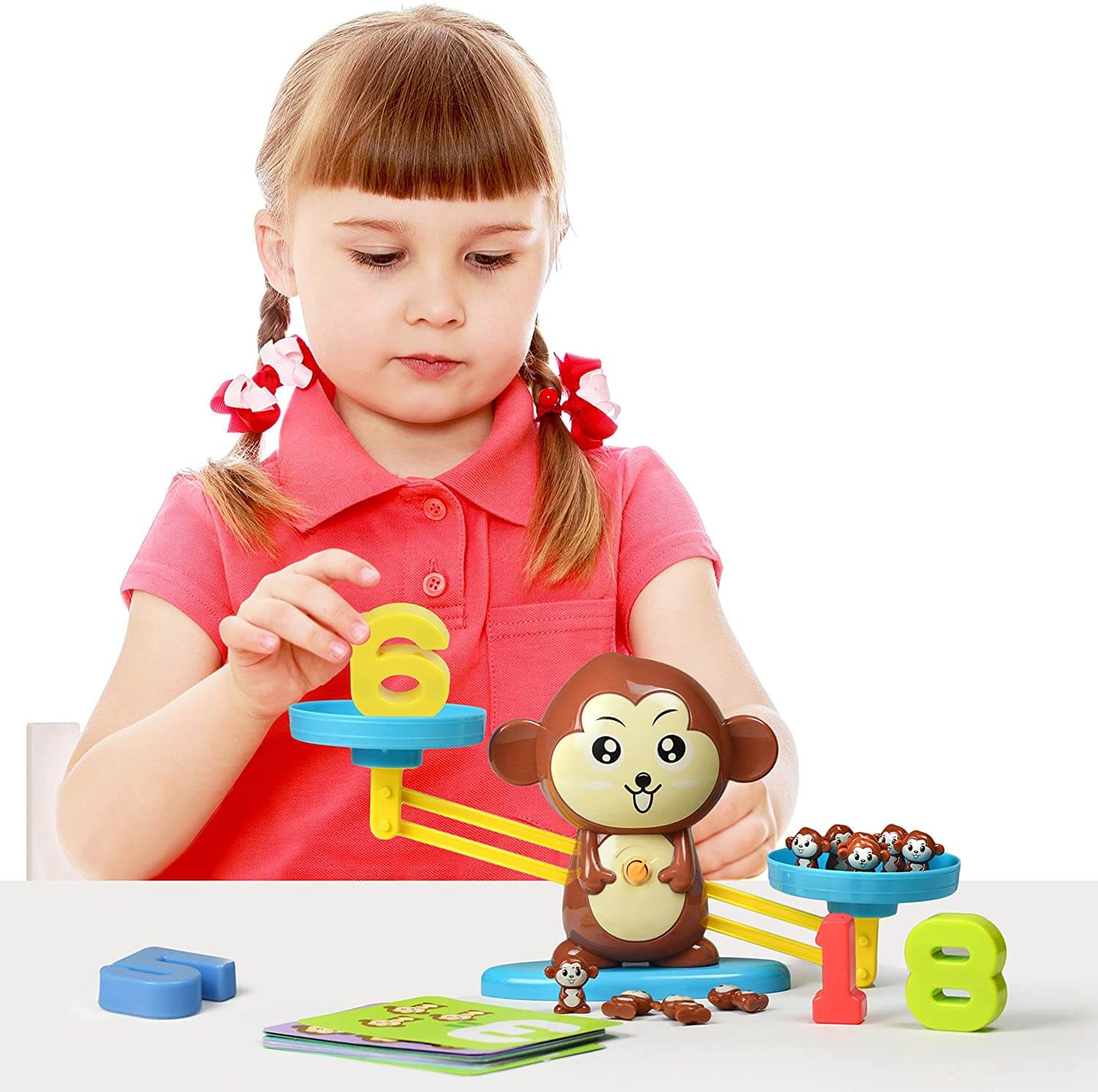 Copilul va selecta o carte și va afla soluția matematică pentru a echilibra maimuțele în miniatură cu numărul corespunzător, folosindu-se de cele două talere ale balanței.