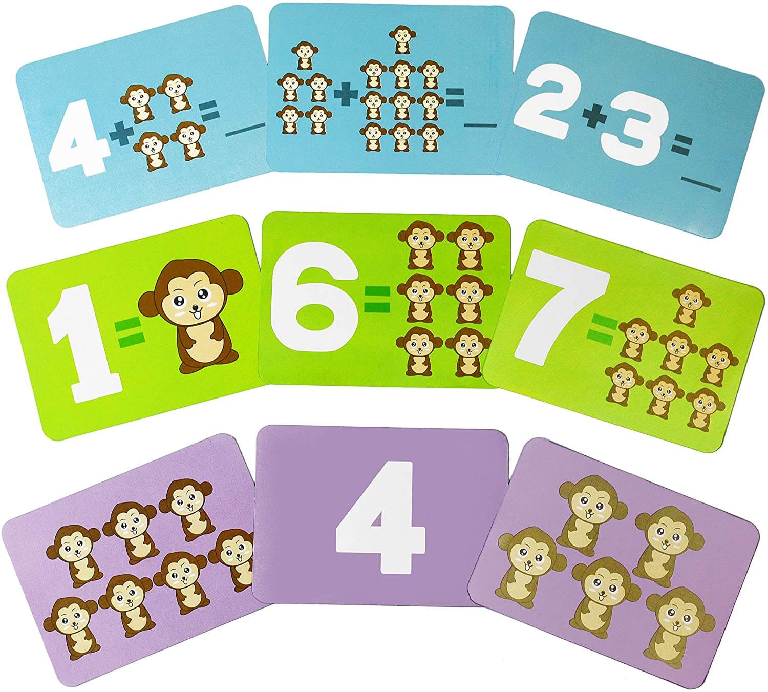 Adăugând mai multe maimuțe și numere pe o parte și numărul corespunzător adunării pe cealaltă parte, copiii vor învăța adunări din ce în ce mai complexe.